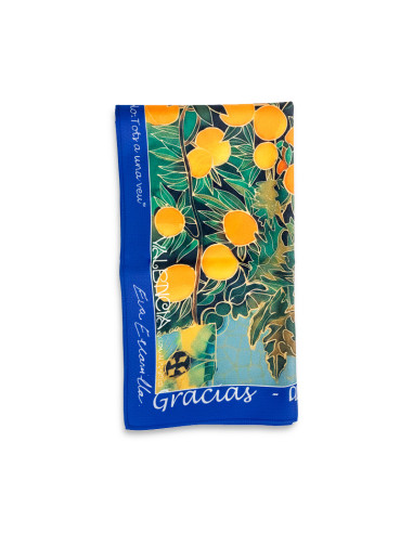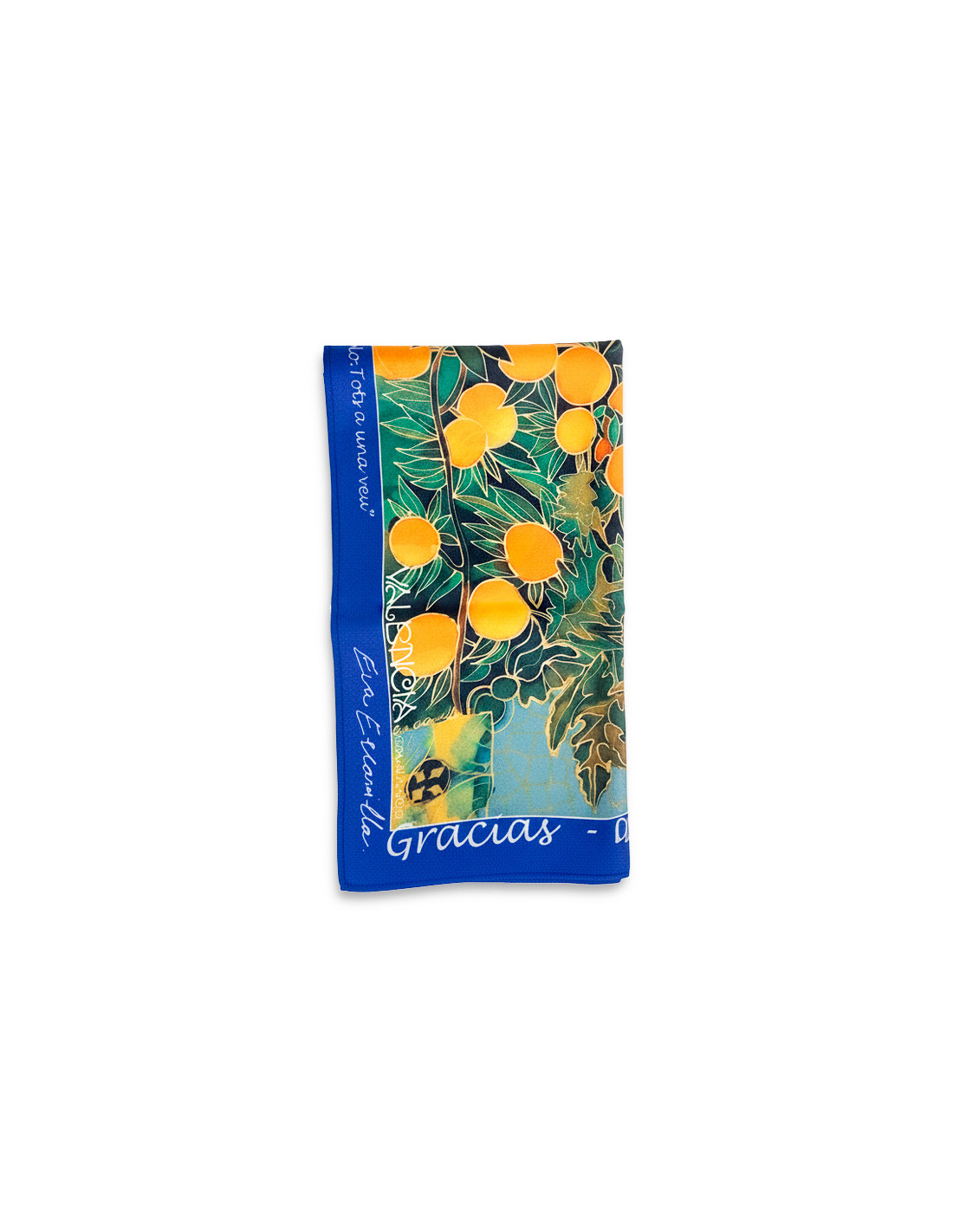 Este pañuelo está impreso a partir del original pintado a mano sobre seda de Eva Escamillas, que representa los mosaicos Art Noveau de la Estación del Norte de Valéncia.
