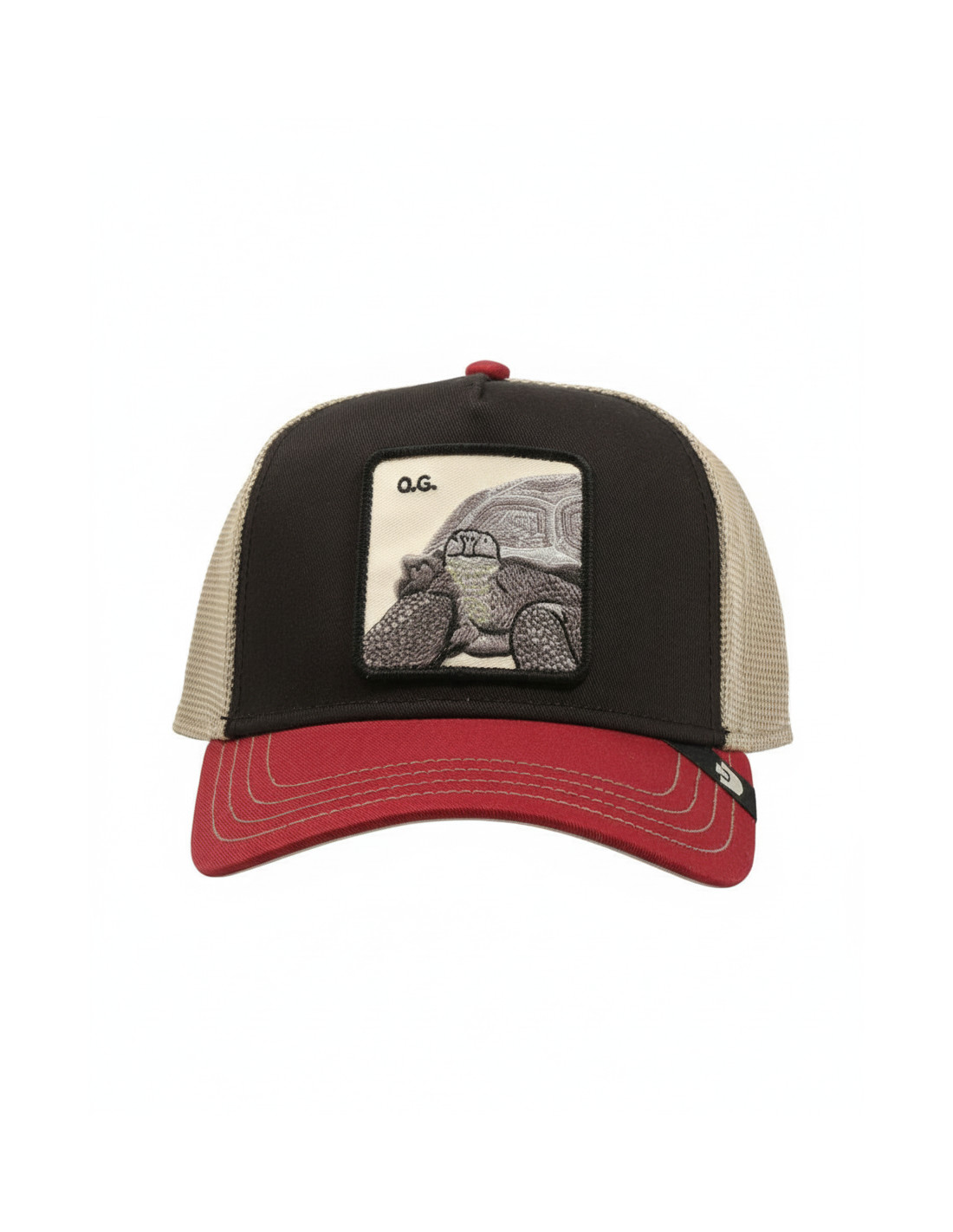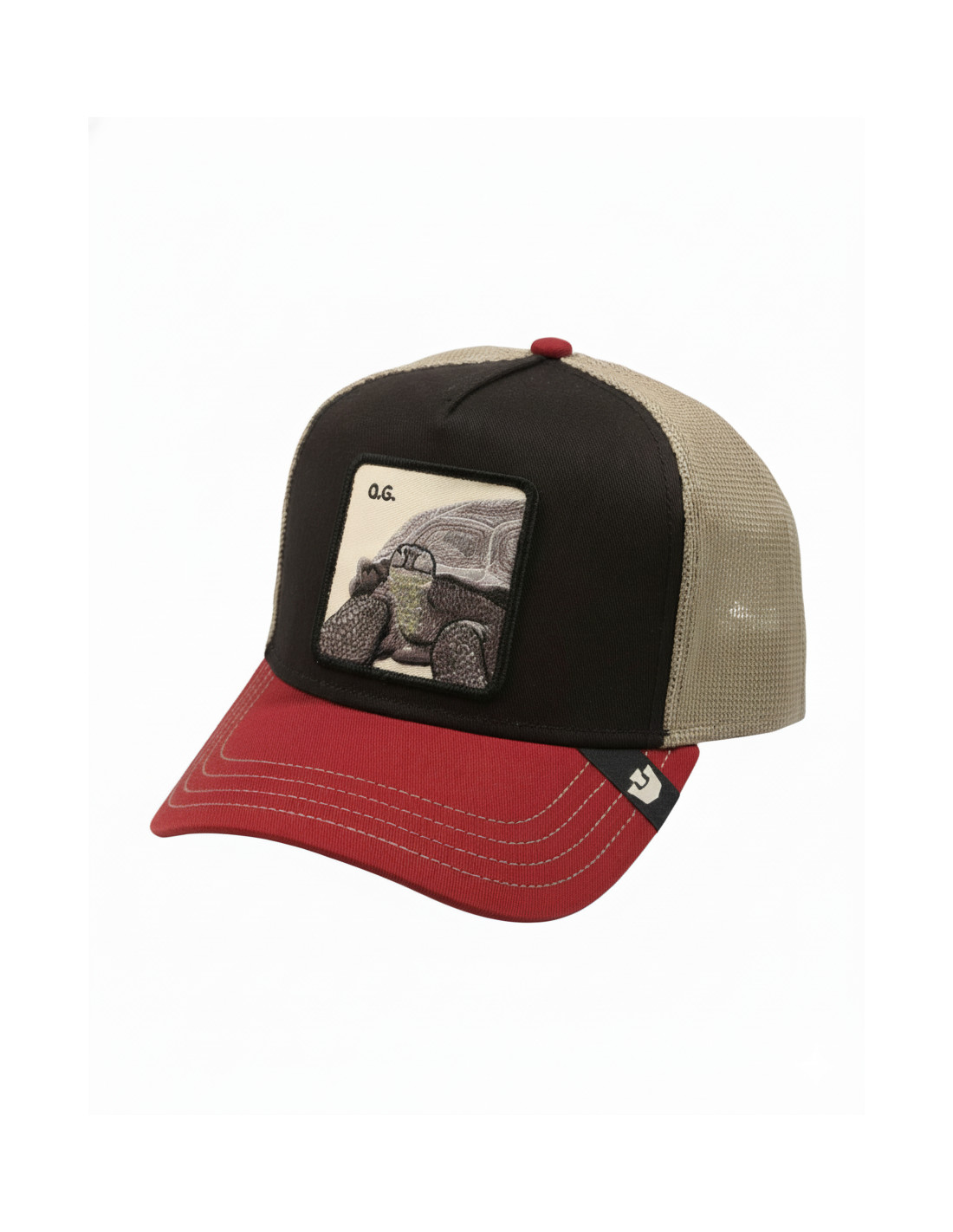 Una original gorra tipo trucker en rojo, azul y beige. En el frontal, un parche con una tortuga.